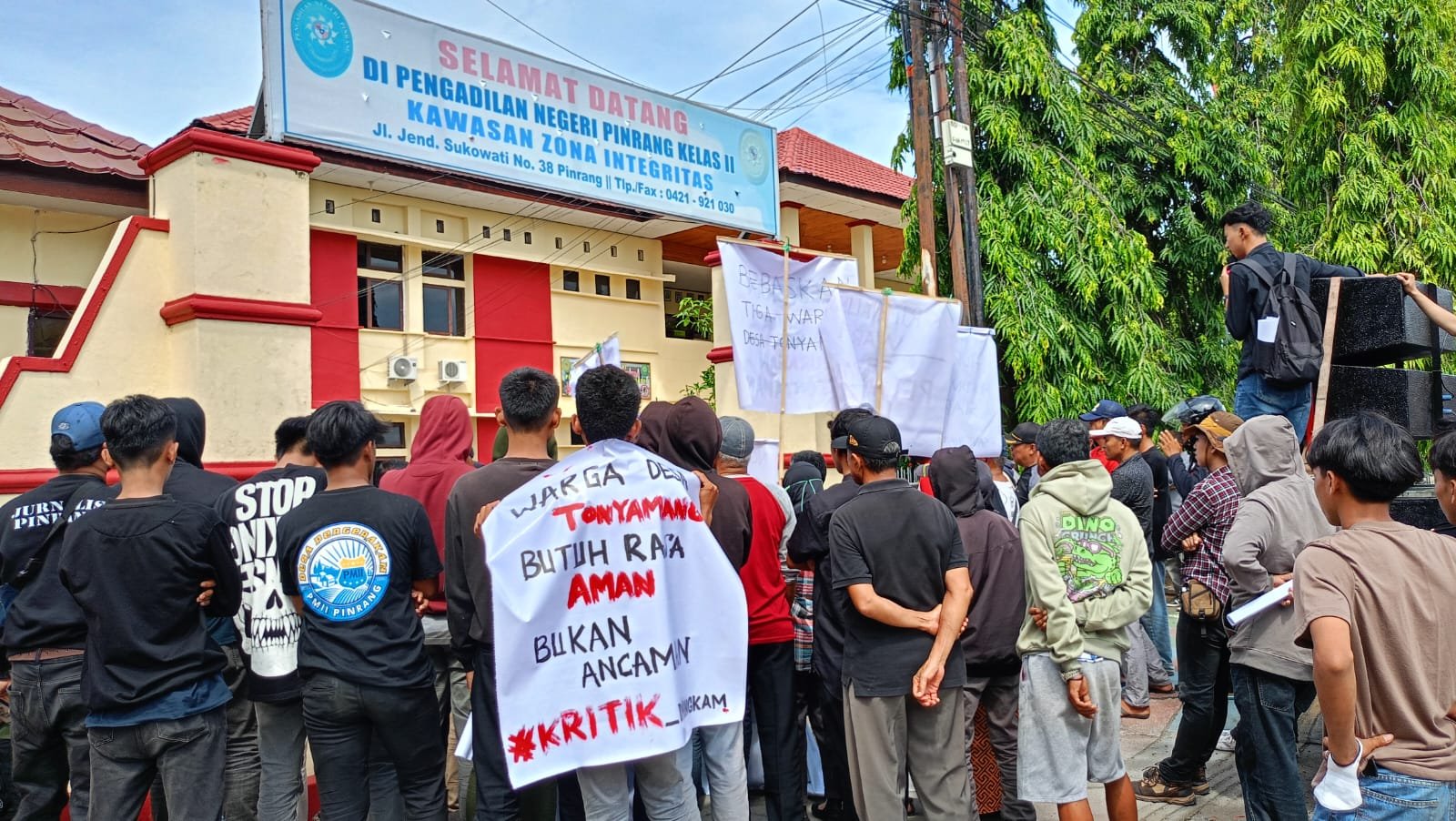 Angindai.com – Sejumlah warga Kelurahan Tonyamang, Kecamatan Patampanua melakukan aksi demonstrasi di Pengadilan Negeri (PN) Pinrang, Sulawesi Selatan (Sulsel). Massa menuntut agar tiga warga yang menjadi tersangka dalam kasus penyegelan tower dibebaskan.