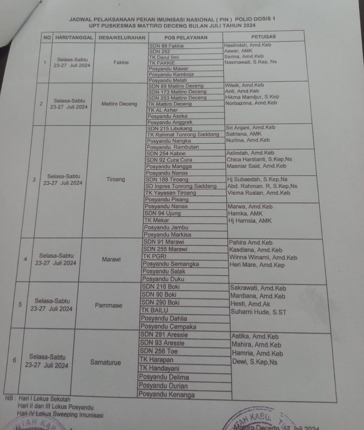 ANGINDAI.COM – Program Pekan Imunisasi Nasional (PIN) Polio Puskesmas Mattiro Deceng, Kabupaten Pinrang bakal sasar 51 TK, SD dan Posyandu se-Kecamatan Tiroang. Pelaksanaan PIN Polio tersebut akan dilaksanakan di enam kelurahan pada tanggal 23 hingga 27 Juli 2024.