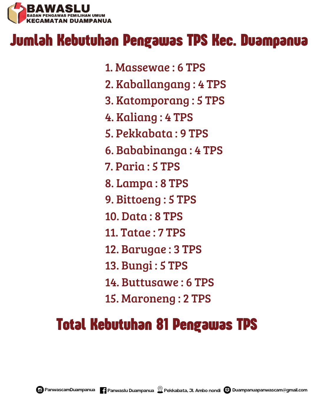 Pengawas TPS Kelurahan/Desa Kecamatan Duampanua, Panitia Pengawas Pemilihan Umum (Panwaslu) Kecamatan Duampanua membuka kesempatan bagi Warga Negara Indonesia yang memenuhi persyaratan untuk mendaftarkan diri sebagai calon anggota Pengawas TPS.
