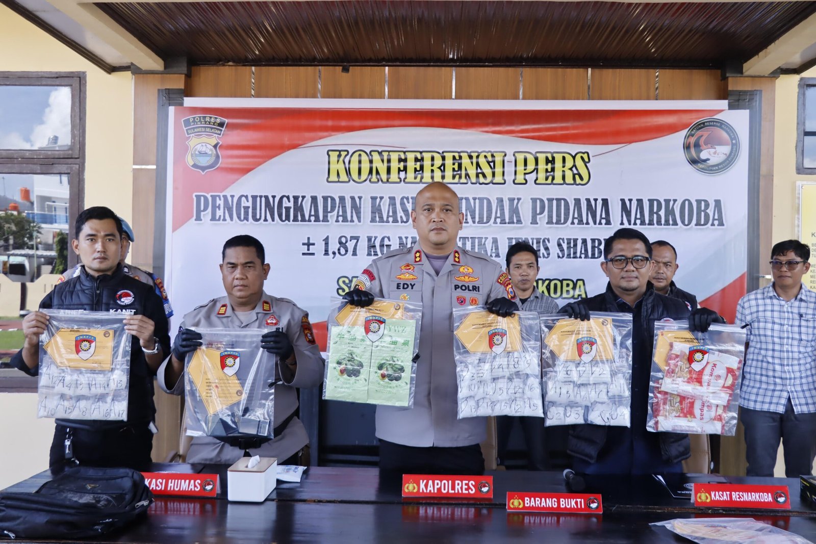 Dalam penggerebekan yang berlangsung di Kabupaten Pinrang, Sulawesi Selatan, polisi menyita barang bukti berupa sabu seberat 1,87 kilogram dengan nilai estimasi Rp2,5 miliar.