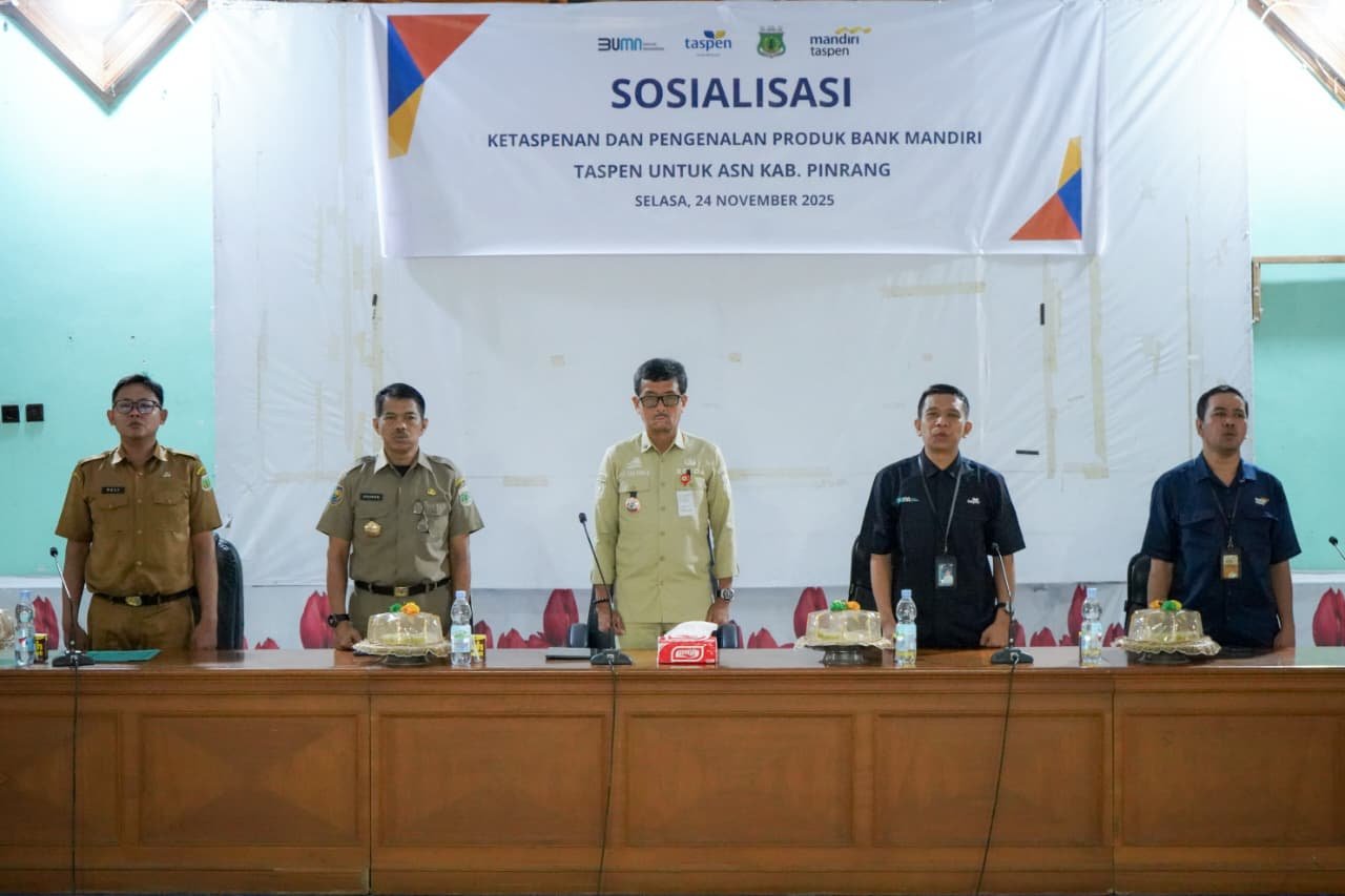 ANGINDAI.COM – Pemerintah Kabupaten Pinrang bekerja sama dengan PT Taspen (Persero) dan Bank Mandiri Taspen menggelar kegiatan Sosialisasi Ketaspenan dan Pengenalan Produk Perbankan bagi Aparatur Sipil Negara (ASN) yang akan memasuki masa purnabakti. Kegiatan ini dilaksanakan di Pinrang pada Selasa (25/11/2025).